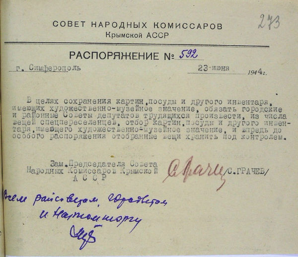 Майно кримських татар, що залишилося на півострові, пізніше описували і здебільшого передавали переселенцям з Росії та України.