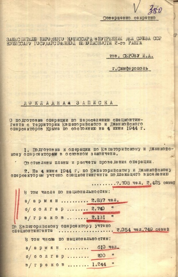 Фото 1. Перша сторінка Доповідної записки про підготовку операції по переселенню спецконтингента з території Євпаторійського і Джанкойського оперсекторів Криму станом на 4 червня 1944 р. (документ КГБ СРСР).