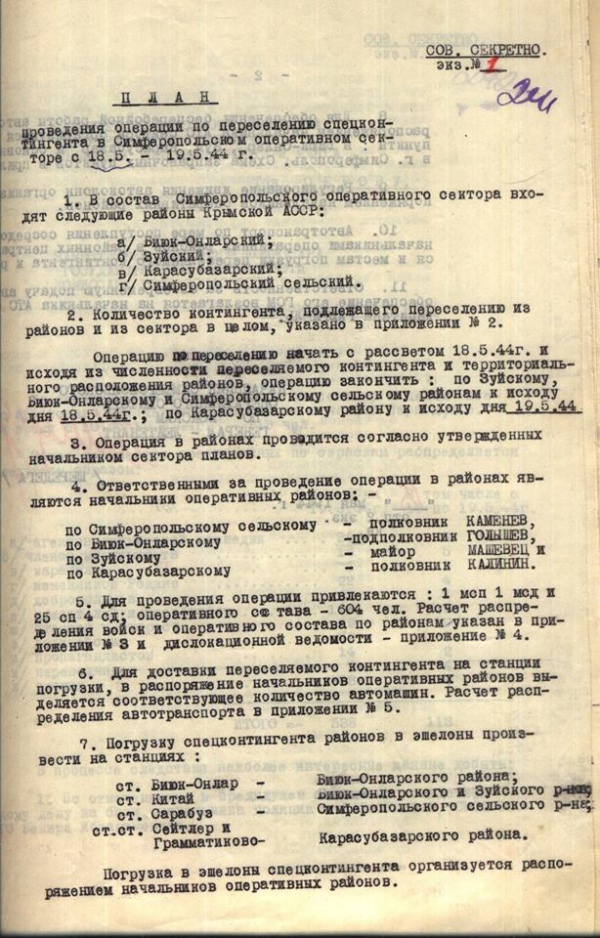 Фото 2. Перша сторінка Плану проведення операції по переселенню спецконтингента в Сімферопольському оперативному секторі з 18.5.-19.5.44 р. (документ КГБ СРСР).