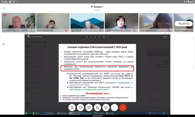 Вступна кампанія 2022 буде непростою. Вячеслав Вячеславович закцентував увагу присутніх на її особливостях. Для вступників на місця державного бюджету буде запроваджений єдиний централізований тест: для випускників шкіл – національний мультипредметний тест, для випускників коледжів – фаховий іспит, бакалаврів до магістратури – іспит в ЗВО. Окрім цього потрібно буде подавати заяву та мотиваційний лист. Вступ на контракт же відбуватиметься за заявою та мотиваційним листом.