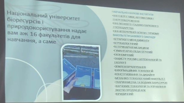 Дарина розповіла учням та наочно продемонструвала відеоматеріал про структуру нашого університету, переваги навчання в ньому, організацію освітнього процесу підготовки спеціалістів, прокоментувала кожну із спеціальностей гуманітарно-педагогічного факультету, зокрема зауважила переваги здобуття фаху психолога. Майбутні студенти мали змогу ознайомитись із значущістю даного спеціаліста, з'ясувати завдання та напрями діяльності. Нинішня першокурсниця поділилися власними переживаннями відносно подальшого професійного визначення та мотивами при обранні майбутнього навчального закладу. Перерахувала позитивні сторони, чому зупинила свій вибір на програмі "Психологія" НУБіП України. Живий інтерес аудиторії викликало студентське самоврядування та його роль у житті університету, робота творчих студій та гуртків. Також Дарина акцентувала увагу на можливості навчання та проходженні виробничої практики за кордоном.