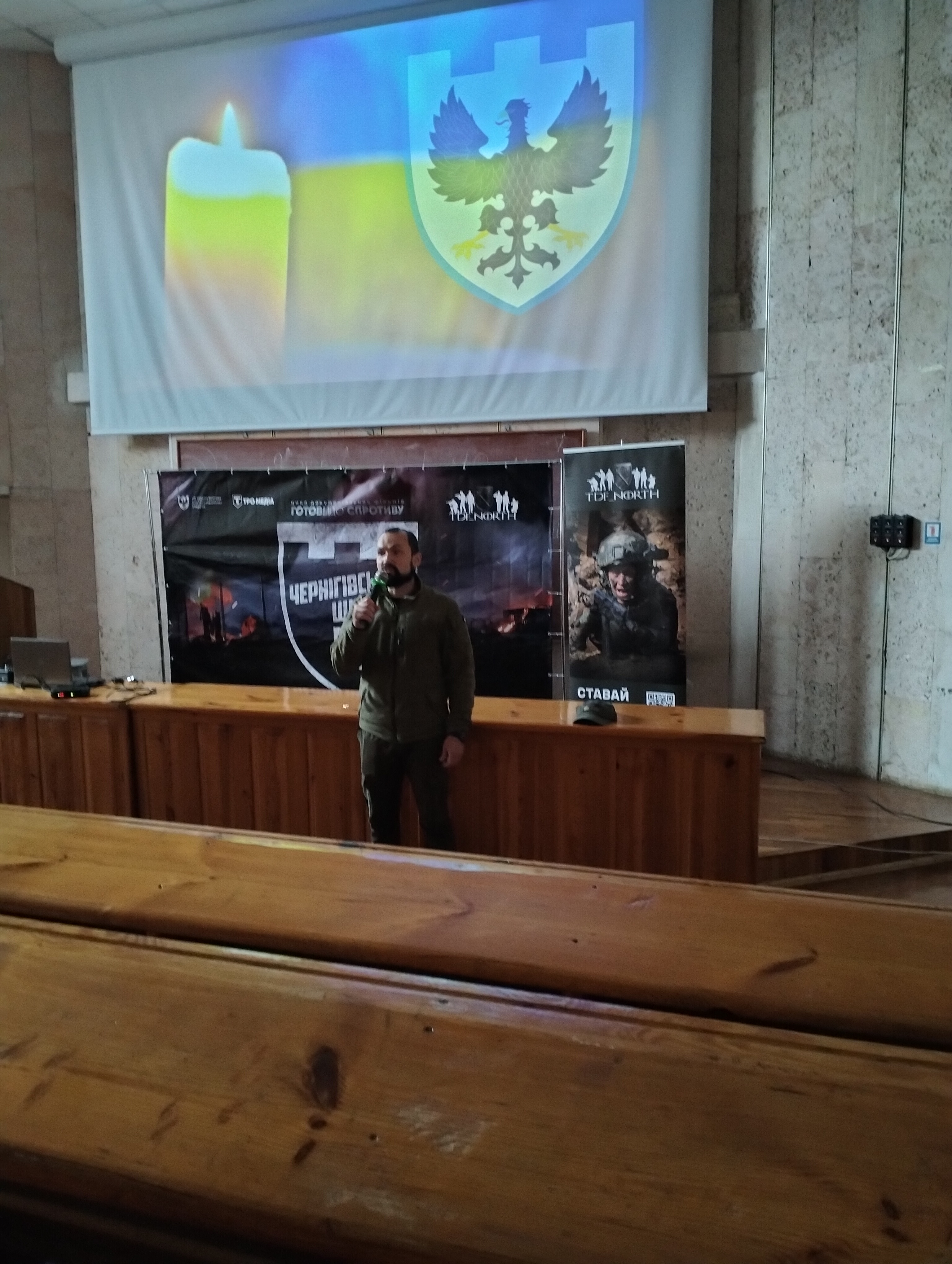 Наставник надихнув студентів на продуктивну навчальну роботу, обговорили документальний фільм «Чернігівський щит», створений у 2022 році військовослужбовцями групи комунікацій Регіонального управління Сил територіальної оборони «Північ» спільно із командою «ТрО Медіа».