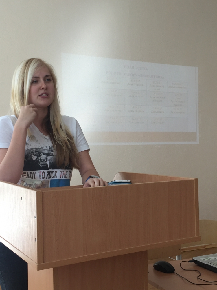 Порядок виступів визначався за бажанням. Отож першою до слова запросили Ірину Магей, що представляла групу 3 курсу СП-1501 напряму підготовки «Соціальна педагогіка». Ірина Магей разом з Братчиковим Вадимом, крім обов’язкової навчальної (соціально-педагогічної) практики, працювали чотири зміни у наметовому таборі «Витоки». Можна тільки захоплюватися такої відданістю студентів третього курсу своєму майбутньому вибору.