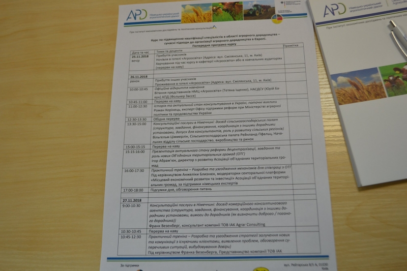 Навчання проходить у НМЦ "Агроосвіта", організаторами є Німецько-український агрополітичний діалог (APD) за підтримки AGRAR CONSULTING IAK.