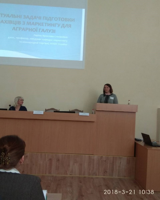 Викладачі кафедри маркетингу та міжнародної торгівлі прийняли активну участь у даному заході. Завідувач кафедри д.е.н., професор Ларіна Я.С. виступила з доповіддю на пленарному засіданні конференції, а к.е.н, доцент Гальчинська Ю.М. доповіла на секційному засіданні.