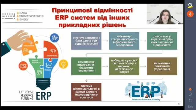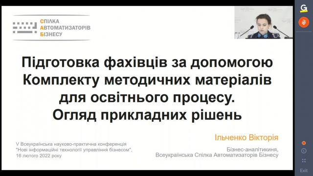 Бізнес-аналітик «Всеукраїнської Спілки Автоматизаторів Бізнесу» Ільченко В.В. зробила огляд прикладних рішень та розповіла про підготовку фахівців за допомогою «Комплекту методичних матеріалів для освітнього процесу»