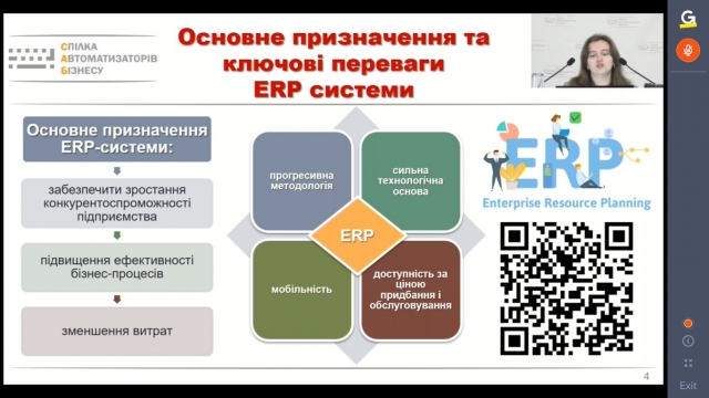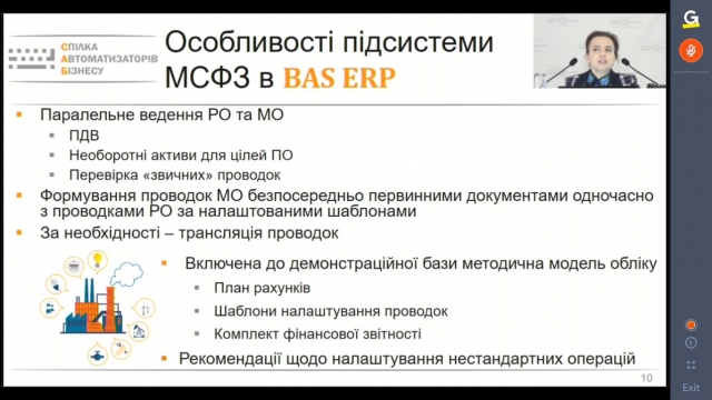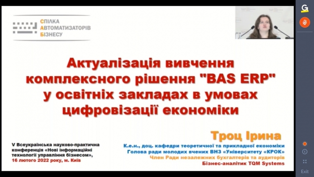 Троц І.В., кандидат економічних наук, доцент кафедри теоретичної та прикладної економіки, голова ради молодих вчених ВНЗ Університет економіки та права «КРОК», член Ради незалежних бухгалтерів та аудиторів, бізнес-аналітик «TQM Systems» свій виступ присвятила актуалізації вивчення комплексного рішення «BAS ERP» у освітніх закладах в умовах цифровізації економіки