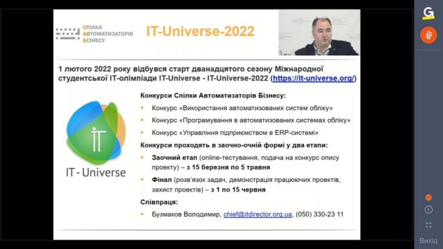 Представник компанії «Комплексні бюджетні системи» Івашин О.О. зробив огляд інноваційного продукту KBS/UA-Бюджет та представив модель співпраці з освітянами. Методист ІС ІТС Хорошун К.О. поділилась досвідом використання інформаційної системи ІТС при підготовці майбутніх бухгалтерів, консультантів та ІТ-спеціалістів.