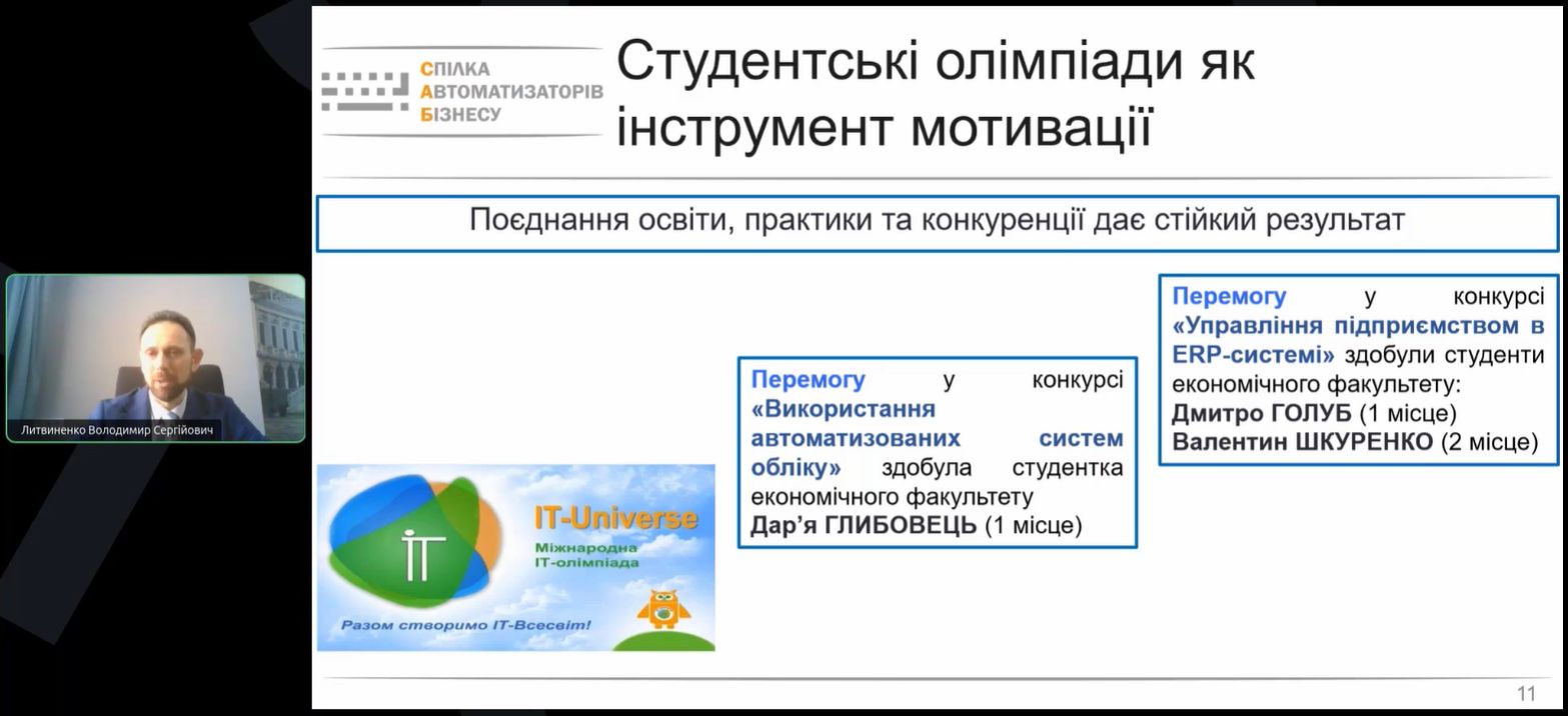 Конференція, організована Спілкою автоматизаторів бізнесу вже вдев’яте, стала платформою для фахового діалогу щодо впровадження новітніх інформаційних технологій у систему управління бізнесом, удосконалення освітніх стандартів і формування екосистеми партнерства між університетами та ІТ-галуззю. Результати обговорень сприятимуть подальшій модернізації освітніх програм, розширенню практичної складової навчання та підвищенню якості підготовки фахівців у сфері автоматизації бізнесу.