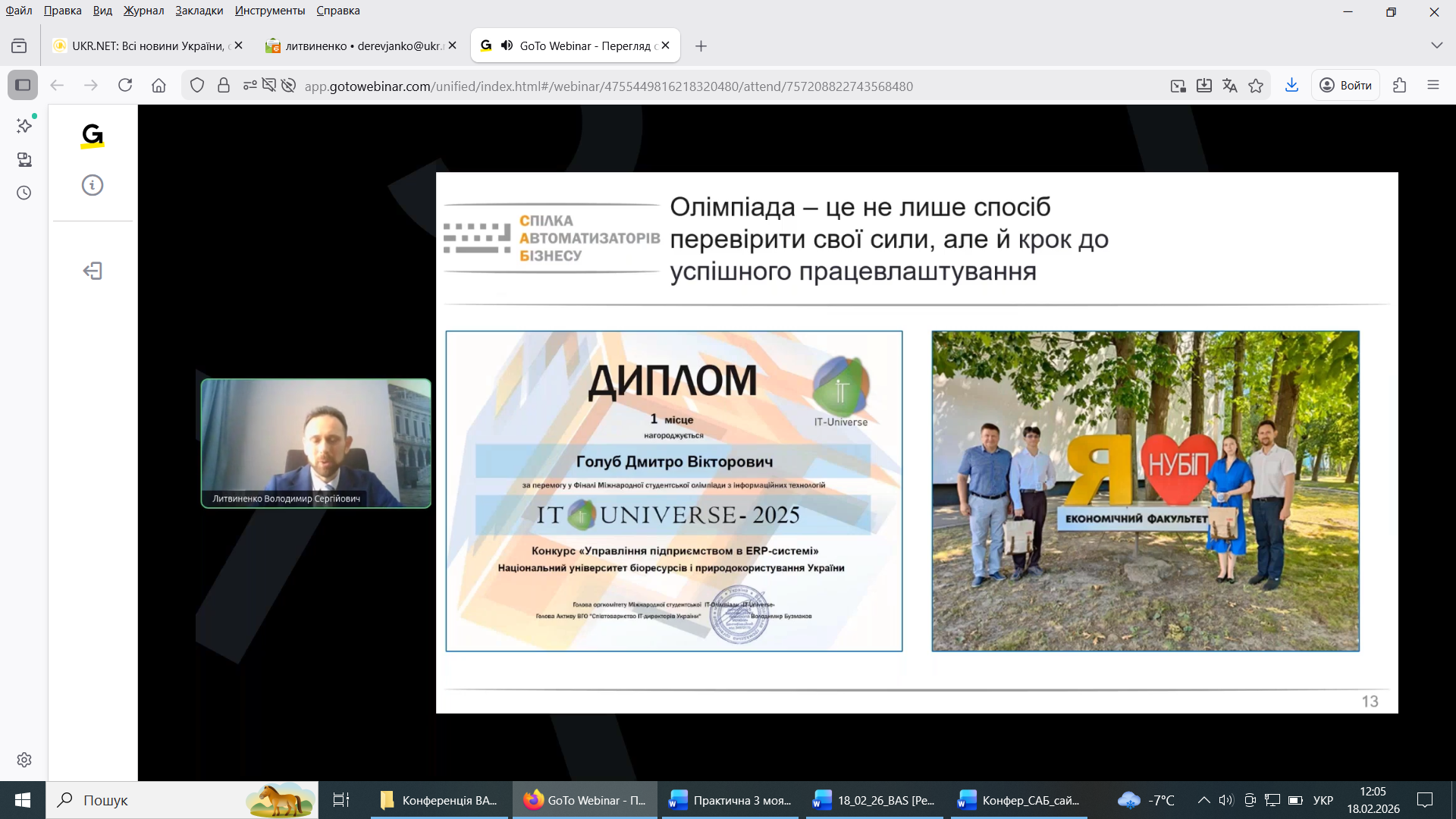 18 лютого 2026 року викладачі кафедри обліку та оподаткування – завідувач кафедри Володимир ЛИТВИНЕНКО, доцентки Олена БОЯРОВА, Тамара ГУРЕНКО,Оксана ДАНІЛОЧКІНА, Світлана ДЕРЕВ’ЯНКО, Наталія КУЗИК, Любов МИСЬКІВ, Людмила МЕЛЬЯНКОВА, Катерина ШЕВЧУК, учасники наукового студентського гуртка «Студія професійного бухгалтера», здобувачі другого (магістерського) рівня вищої освіти Юрій СІМОНИК та Марія КУЧЕРЧУК взяли участь у роботі ІХ Всеукраїнської науково-практичної конференції «Нові інформаційні технології управління бізнесом», організованій Спілкою автоматизаторів бізнесу спільно з Київським національним університетом ім. Тараса Шевченка. Конференція стала фаховим майданчиком для обговорення стратегічних напрямів цифрової трансформації управління, модернізації освітніх програм та посилення інтеграції між університетським середовищем і бізнесом. Захід відбувся в онлайн-форматі, з можливістю переглянути трансляцію конференції за індивідуальними посиланням, яке отримали зареєстровані учасники на свої електронні адреси.
