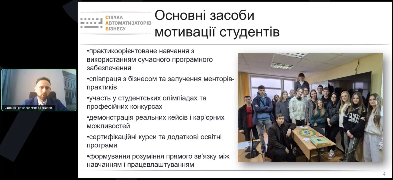 Підводячи підсумок, Володимир ЛИТВИНЕНКО зауважив, що системна взаємодія з бізнесом є важливим чинником підвищення мотивації здобувачів освіти до опанування сучасних програмних продуктів, оскільки поєднує теоретичну підготовку з реальними практичними потребами ринку, формує прикладні компетентності та сприяє професійному становленню майбутніх фахівців.