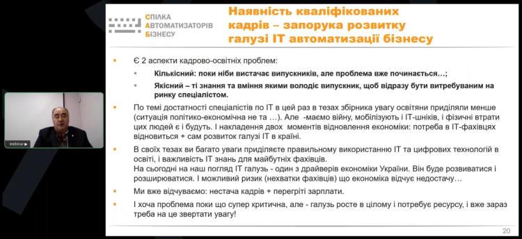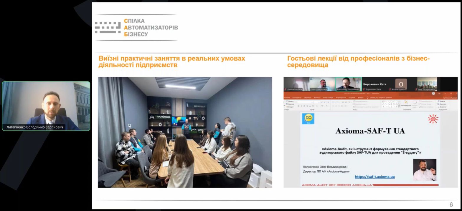Одним із ключових напрямів дискусії стала діяльність Всеукраїнської Спілки Автоматизаторів Бізнесу. Голова Спілки Вадим МАЗУР представив аналітичний огляд стану автоматизації бізнесу в Україні, пріоритети розвитку галузі та освітні ініціативи, спрямовані на підготовку фахівців із впровадження та супроводу сучасних ІТ-рішень.