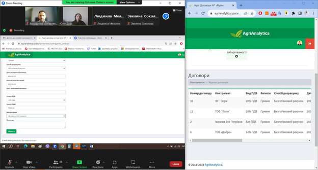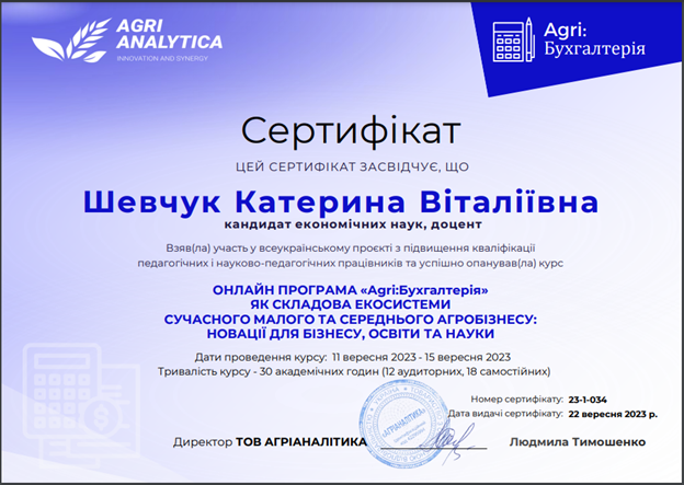 Протягом двох тижнів, з 11 по 29 вересня 2023 року, викладачі кафедри обліку та оподаткування проходили курс підвищення кваліфікації з використання програми АGRI:Бухгалтерія на тему: «АGRI:Бухгалтерія - як складова екосистеми сучасного малого та середнього агробізнесу: новації для бізнесу, освіти та науки», яку презентувала компанія «AGRIANALYTICA».