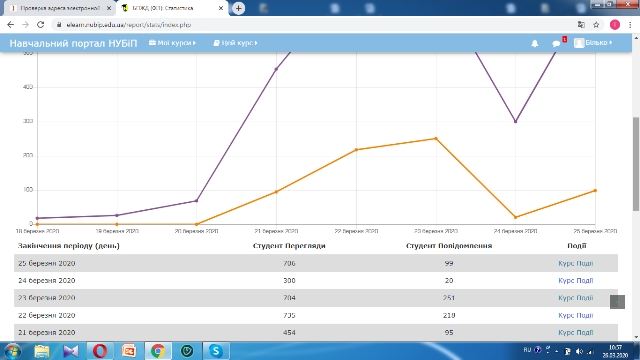 З 11 березня 2020 року відповідно до наказу ректора НУБіП України № 247 навчання студентів нашого університету відбувається дистанційно за допомогою навчального порталу НУБіП України https://elearn.nubip.edu.ua/, а також за допомогою інших інтернет-ресурсів. Перехід на дистанційну форму навчання студенти і викладачі кафедри охорони праці та інженерії середовища сприйняли з розумінням. Студенти добре знайомі з принципом роботи цієї навчальної платформи і без особливих складнощів можуть виконувати лабораторні роботи і вивчати лекційний матеріал. Наприклад, дисципліни з охорони та безпеки праці викладаються у студентів майже всіх спеціальностей університету завідувачем кафедри О. В. Войноловичем, доцентами кафедри ОПІС М. М. Мотричем, В. М. Поліщуком, Т. П. Зубок, Є. І. Марчишиною, Т. О. Білько, ст. викладачем С. М. Голопурою. З перших днів карантину були подані основні роз’яснення щодо особливостей навчального процесу під час карантину, узгоджений план роботи по дисципліні, також були створені Viber-групи з дисципліни. Викладачами прописаний хід виконання роботи, перелік завдань, а також є методичні рекомендації для чіткої роботи. Лабораторні роботи мають всі необхідні елементи для їх успішного виконання. Аналізуючи статистику відвідувань курсу студентами за минулий тиждень можна сказати, що студенти активно працюють над завданнями, вчасно відправляють на перевірку виконані лабораторні роботи. За розкладом навчальних занять були проведені заняття, саме в цей період спостерігалась найбільша активність студентів. Викладачі кафедри мають постійний діалог із студентами через Viber-групи та листування електронною поштою. Студенти щоденно відправляють на перевірку виконані лабораторні роботи, розрахунки, цікаві презентації до самостійної роботи і задають питання. Можна впевнено сказати, що на кафедрі активно продовжується навчальний процес, а також зворотній зв'язок між викладачами і студентами.