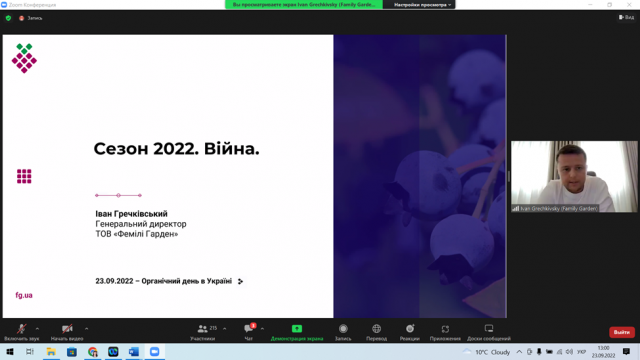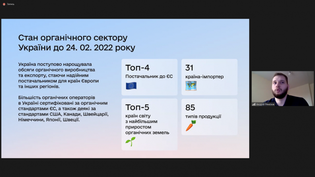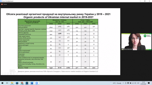 Олена Манзюк, заступник керівника відділу сертифікації, стандартизації та якості ТОВ «Органік Стандарт» повідомила, що не зважаючи на повномасштабну війну українські органічні виробники запустили нові продукти у 2022 р. (пастила, каші та крем-супи швидкого приготування, сік нектарину та ефірні олії).