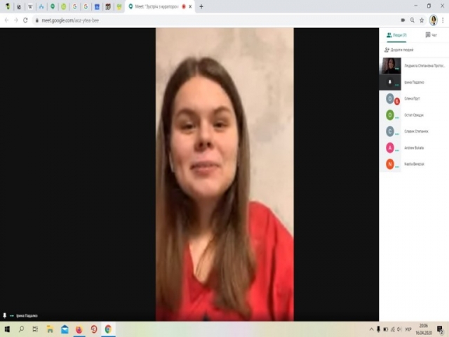 Під час останньої он-лайн зустрічі 18 квітня студенти розповіли про процес навчання, цікавилися чи ще довго протримається карантин, як проходитиме заліково-екзаменаційна сесія. Куратор поцікавилася станом здоров'я студентів, ознайомила із тимчасовими положеннями про організацію сесій та практичного навчання на період карантину, по можливості намагалася дати відповіді і на інші питання. Наостанок вона привітала студентів з Великодніми святами.