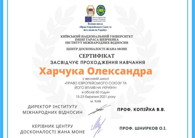 У березні 2021 р. відбулася щорічна школа Центру досконалості Жана Моне Київського національного університету імені Тараса Шевченка Інституту міжнародних відносин. Метою проведення заходу «Право Європейського Союзу та його вплив на Україну» стало розповсюдження знань про еволюцію права Європейського Союзу, сучасний стан та перспективи розвитку, вплив Брекзіту на право ЄС; дослідження мультидисциплінарних аспектів та дезінтеграційних процесів; визначення правових основ спільних політик Євросоюзу (спільної міграційної політики, конкурентної політики ЄС, простору свободи, безпеки і юстиції); розгляд основ «європеїзації» правового порядку України.