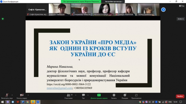 Професор кафедри, доктор філологічних наук Марина Навальна зосередила увагу на прийнятті закону як одному з кроків вступу України до ЄС, показала структуру «Закону «Про медіа», закцентувала на тих медійних законах, які втратили чинність.