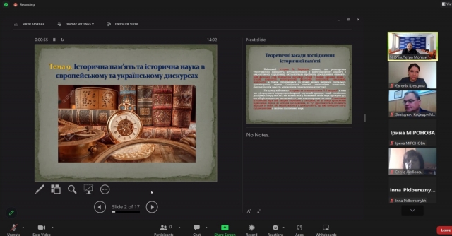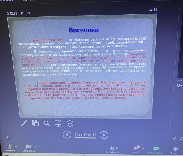 10 травня 2023 р. викладачі та аспіранти кафедри міжнародних відносин і суспільних наук долучились до дев’ятої відкритої онлайн лекції доктора історичних наук, професора Юрія Котляра «Історична пам’ять та історична наука в європейському та українському дискурсах», що проходила у межах циклу «Україна і Європа: ціннісні аспекти спільної історичної долі».