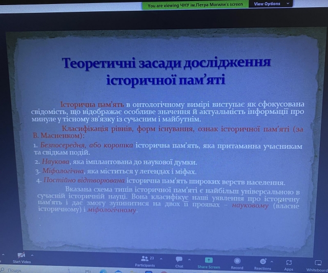 На лекції зазначалося, що історична пам`ять є сукупністю масових уявлень соціуму про спільне історичне минуле. В онтологічному вимірі вона виступає як сфокусована свідомість суспільства, відображає особливе значення й актуальність інформації про минуле в тісному зв’язку із сучасним і майбутнім.