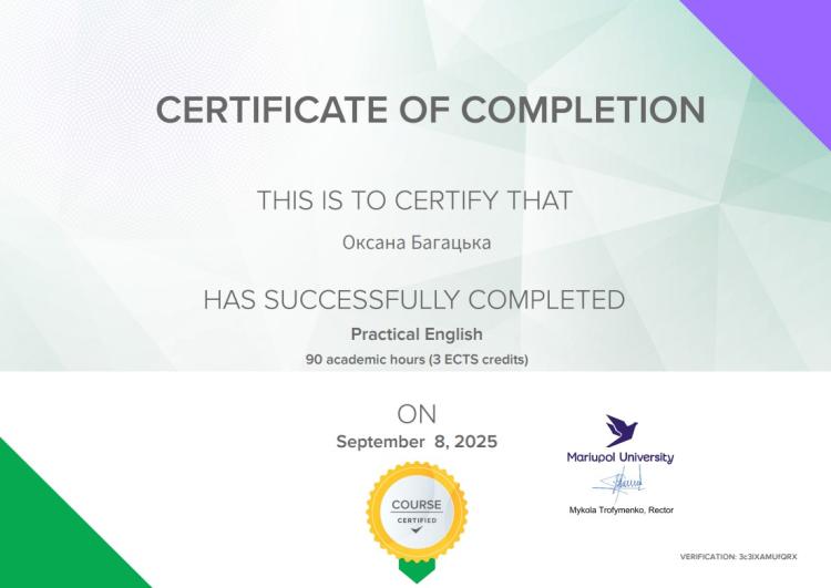 З 15 травня по 12 вересня 2025 року доцент кафедри Оксана БАГАЦЬКА опановувала 100 уроків курсу «Practical English». Вивчати англійську мову з English4Ukraine було зручно як на мобільному пристрої, так і та персональному комп’ютері.