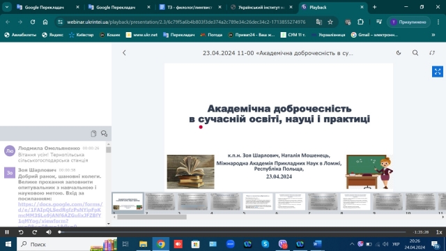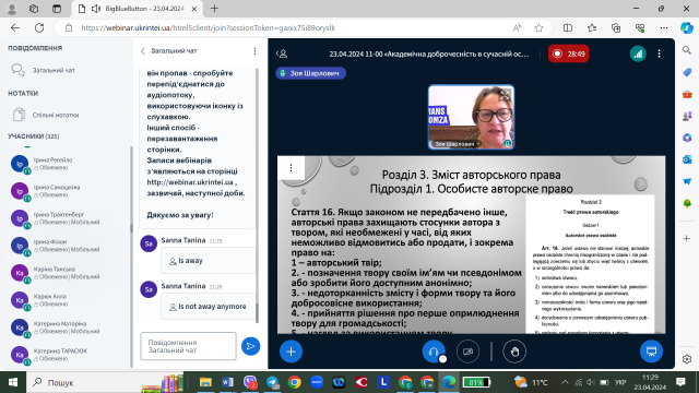 У публічному просторі однією з розглядуваних тем є тема академічної доброчесності в різних сферах буття. Однак найактивніше обговорюють питання академічної доброчесності в науці й освіті, адже списати, запозичити і «забути» вказати автора ‒ це не тільки і стільки про нечесність перед собою, колегами, це нівеляція освіти і науки. Оновлювати знання про академічну доброчесніть важливо, особливо в розрізі чинного законодавства, етичних норм використання штучного інтелекту. Саме тому 23 квітня 2024 року викладачі і студенти кафедри журналістики та мовної комунікації взяли участь відкритому науково-практичному семінарі від УкрІНТЕІ, присвяченому цій темі.