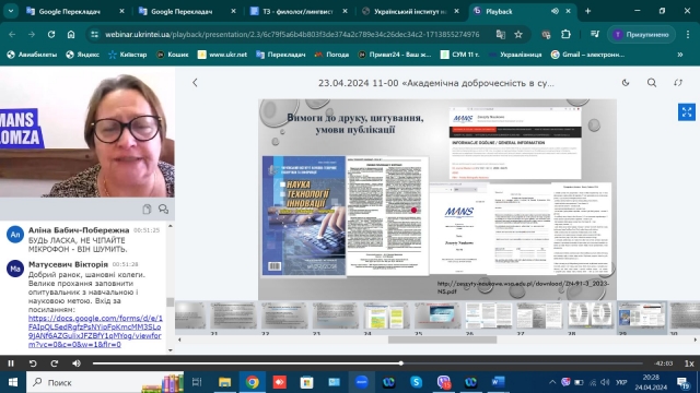 УкрІНТЕІ 23 квітня 2024 р. провів відкритий науково-практичний семінар на тему «Академічна доброчесність в сучасній освіті, науці і практиці». У цьому вебінарі взяли участь професори кафедри журналістики та мовної комунікації Тетяна Семашко, Світлана Харченко і студенти спеціальності «Журналістика».
