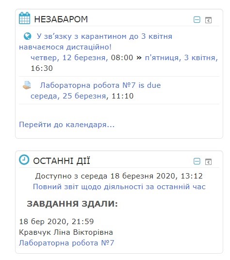 Студенти опрацьовують теоретичний матеріал у вигляді лекцій, презентацій до лекцій. Згідно графіку здійснюється виконання лабораторних робіт, які надсилаються на перевірку. На разі виконується Л.Р. №7. Результати взаємодії та виконання завдань представлені на зображеннях.