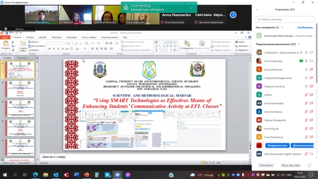 03 лютого 2022 року за сприяння декана гуманітарно-педагогічного факультету Інни Савицької та директора гімназії № 261 м. Києва Світлани Небож відбувся науково-методичний онлайн-семінар «Використання СМАРТ-технологій як одного з дієвих засобів активізації мовленнєвої діяльності учнів на уроках іноземних мов», організований кафедрою англійської мови для технічних та агробіологічних спеціальностей для вчителів іноземних мов шкіл та гімназій Дарницького району м. Києва.