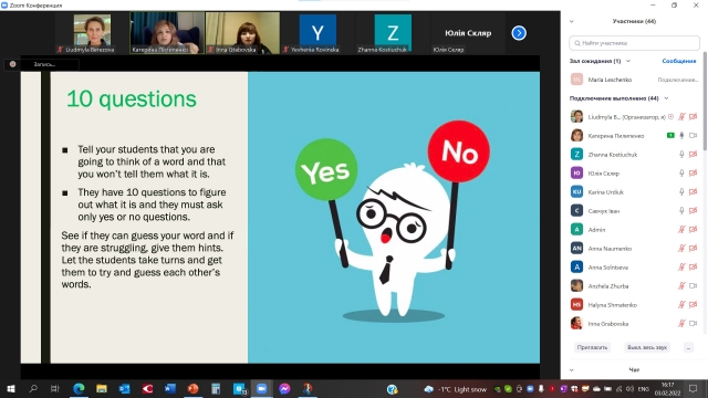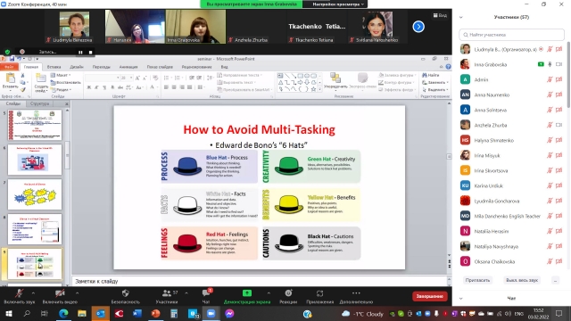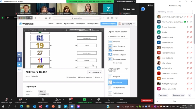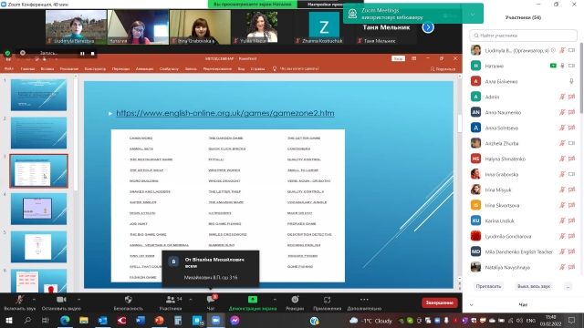 Учителі іноземних мов гімназії № 261 м. Києва Валентина Грабовська та Людмила Даценко доповіли про актуальну і наразі недостатньо вивчену проблематику розробки системи вправ із розвитку навичок розмовного мовлення учнів у сесійних залах платформи Zoom на онлайн-заняттях із англійської мови та використання платформи “Word Wall” у системі НУШ на уроках англійської мови.