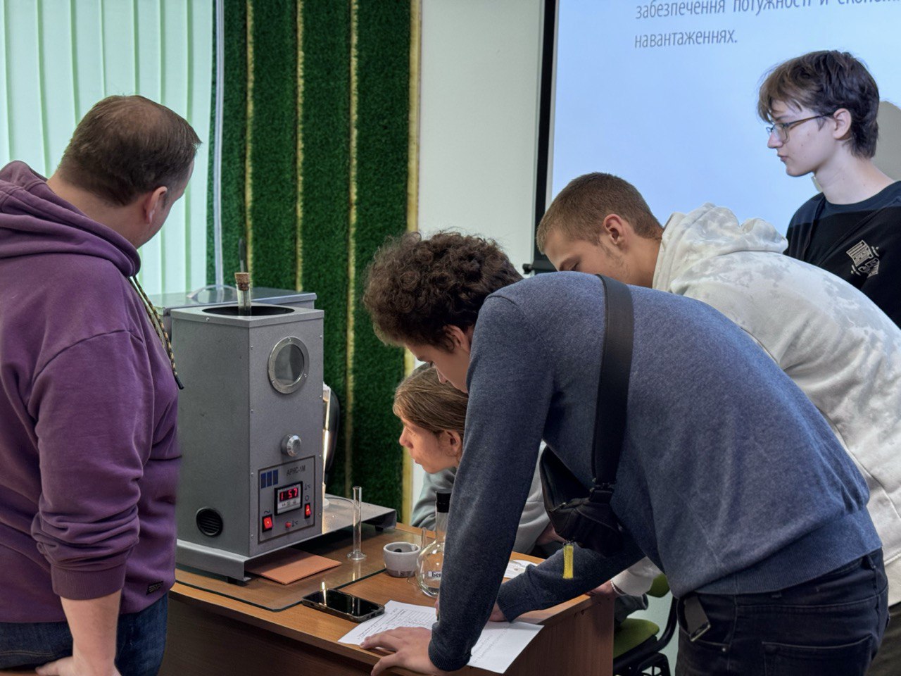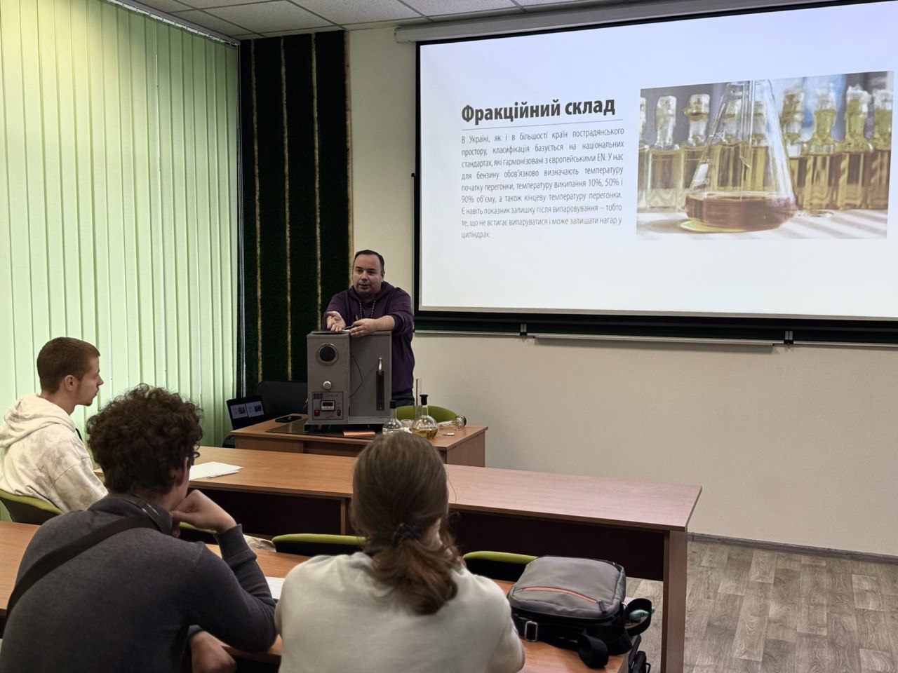Захід розпочався з теоретичної частини, яку провів завідувач кафедри, доктор технічних наук, професор Євген КАЛІНІН. За допомогою мультимедійної презентації він детально розповів учням про основні характеристики палива, його якість та вплив на роботу двигуна та екологічні показники. Професор наголосив на важливості технічних знань для юних науковців і водночас продемонстрував, як сучасні технології допомагають аналізувати склад і властивості палива.