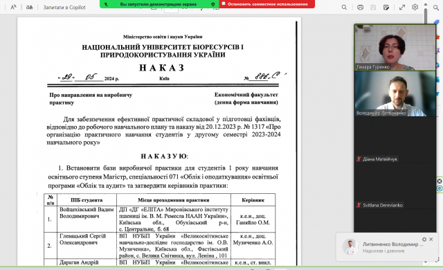 Гарант освітньої програми, доцент кафедри обліку та оподаткування Тамара Гуренко ознайомила здобувачів вищої освіти із Наказом № 886 «С» від 29.05.2024 р. «Про направлення на виробничу практику» здобувачів другого (магістерського) рівня вищої освіти спеціальності 071 «Облік і оподаткування» освітньої програми «Облік і аудит» з 08.07.2024 р. до 25.10.2024 р. Гарант ознайомила магістрів із методичними рекомендаціями, які розміщені на сайті кафедри обліку та оподаткування та орієнтовним тематичним планом з питань організації бухгалтерського обліку та облікового процесу суб’єкта господарювання; особливостями формування облікової політики та функціонування облікових підрозділів на підприємстві; документування господарських операцій з документообігу; особливостями організації обліку активів, капіталу та зобов’язань; формуванням та опрацюванням фінансової й управлінської звітності суб’єкта господарювання; особливостями оподаткування прямими та непрямими податками; плануванням внутрішнього контролю на підприємстві з методикою узагальнення його результатів для прийняття управлінських рішень. Сконцентрована увага магістрів на проведенні оцінка стану обліку (аналізу, контролю (аудиту) у відповідності до предмета та об’єкта дослідження магістерської кваліфікаційної роботи.Була звернута увага на терміни підготовки, здачі на перевірку та захисту звітів відповідно до наказу.