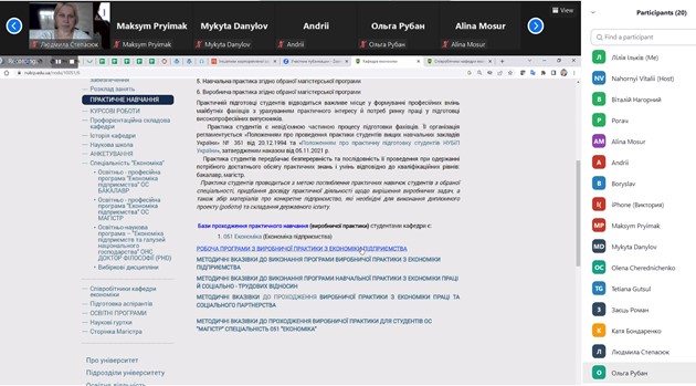 Гарант ОПП «Економіка підприємства» ОС Магістр Гуцул Т.А. ознайомила студентів з програмою виробничої практики та виокремила основні завдання проходження практики: вивчення структури та організації діяльності підприємств за місцем проходження практики; ознайомлення із звітною документацією; ознайомленні з методологією аналізу та планування показників діяльності підприємства. Доцент кафедри економіки, керівник магістерських робіт Степасюк Л.М. ознайомила студентів з порядком проходження практики, а також надала інформацію про особливості написання звіту про практику.