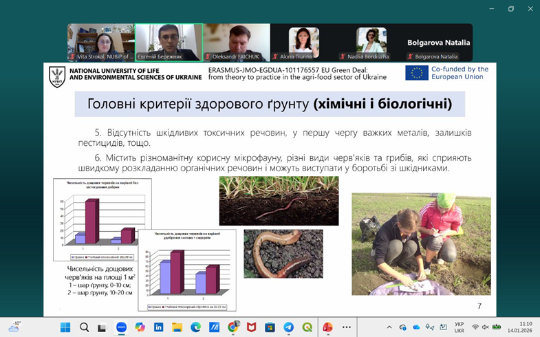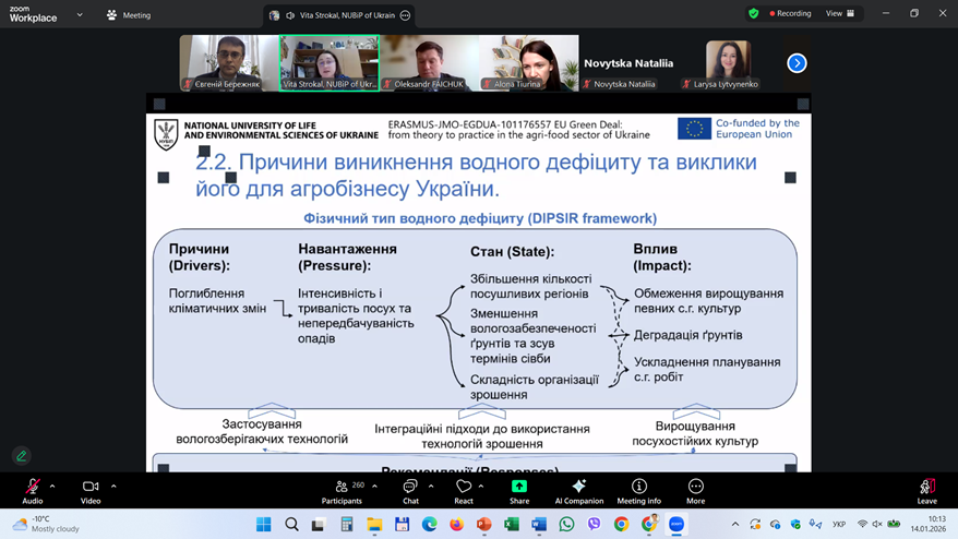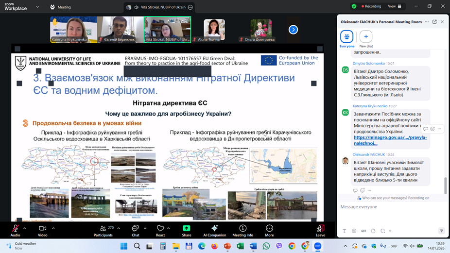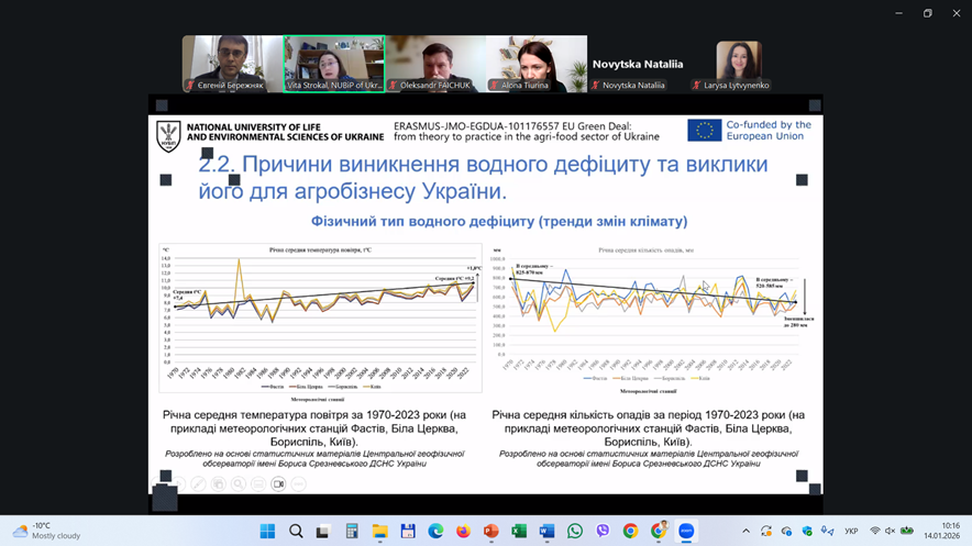 У якості запрошених викладачів-спікерів були також і доценти кафедри екології агросфери та екологічного контролю Віта СТРОКАЛЬ і Євгеній БЕРЕЖНЯК. Так, 14 січня 2026 р. першою із доповіддю на тему «Виклики водного дефіциту для агробізнесу» виступила Віта СТРОКАЛЬ, у якій розкрила гострі питання, які пов’язані із якістю поверхневих вод, причинами виникнення водного дефіциту та викликами його для агробізнесу України. Спікерка також ознайомила присутніх колег і з питаннями взаємозв’язків між виконанням Нітратної Директиви Європейського Союзу та водним дефіцитом. Цікаво було почути і про нові підходи інтеграції щодо ресурсо-ефективного сільського господарства із врахуванням вимог Нітратної Директиви. Наприкінці свого виступу Віта СТРОКАЛЬ презентувала приклади власних досліджень щодо вимірювань водного дефіциту для потреб зрошення, базуючись на зібраних даних по Київському водосховищу.