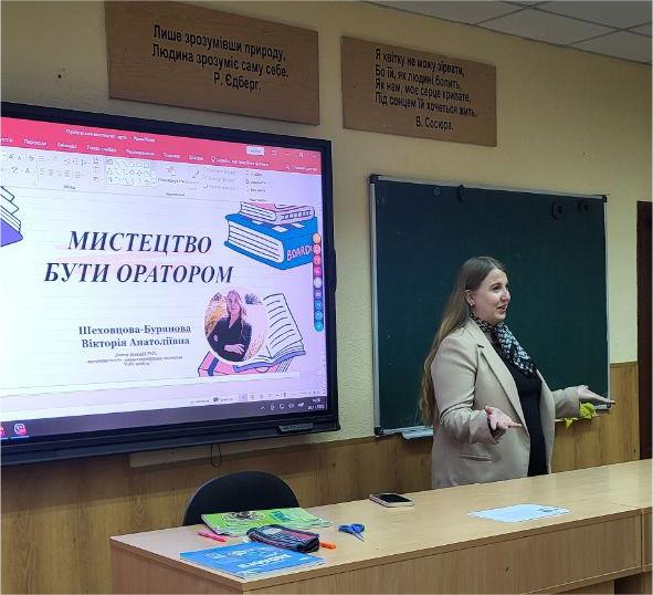 Після презентаційної частини відбувся практичний майстер-клас «Мистецтво бути оратором», під час якого учні активно тренували навички публічного виступу. Разом із Вікторією ШЕХОВЦОВОЮ-БУРЯНОВОЮ вони обговорювали, як подолати страх перед аудиторією, правильно структурувати промову, сформувати перші секунди виступу для привернення уваги, чому паузи роблять мовлення сильнішим, а також як правильно працювати з дикцією, голосом та темпом для досягнення переконливості.
