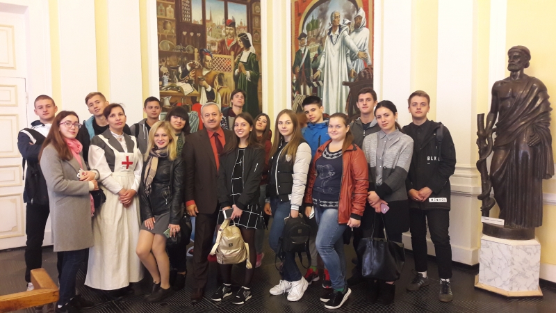 Студенти на чолі куратора групи Ржевського Геннадія Миколайовича та екскурсовода мали можливість переглянути в першому і в другому залах освітлюється становлення і розвиток медицини в Україні з прадавніх часів до наших днів. Серед експонатів звертають на себе увагу історичні реліквії, старовинний медичний інструментарій, лікарські рослини, які вживалися в народній медицині, літописні джерела. Особливий інтерес представляє натурний інтер'єр старовинної лазні часів Київської Русі Х віки, яка використовувалася не лише для гігієнічних цілей, але і для лікування.