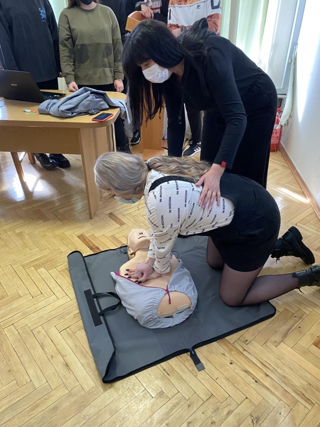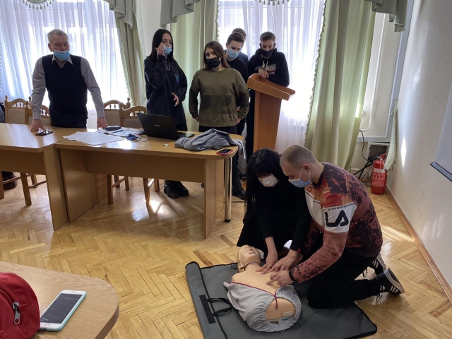 Прослухавши теоретичний матеріал та подивившись на приклад професійних дій при надані домедичної допомоги спеціалістом, студенти мали змогу практично закріпити отримані знання по серцево-легеневій реанімації на представленому манекені, що імітував постраждалу людину.