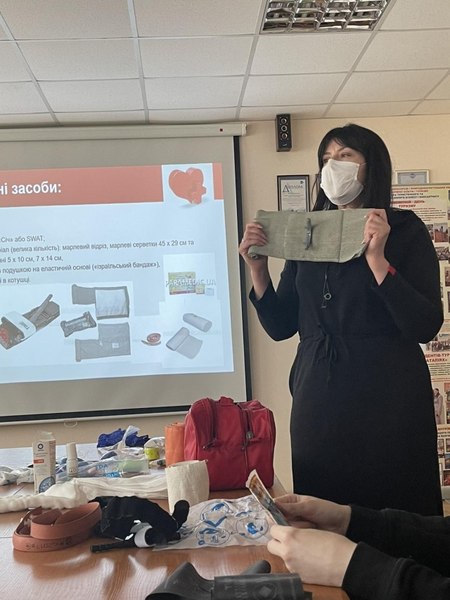Тренер розповіла про склад аптечки домедичної допомоги, призначення кожного засобу та наявно продемонструвала алгоритм роботи з кожним елементом.