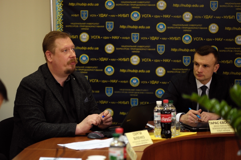 Першим до слова запросили одного з розробників вищезгаданого Закону, помічника-консультанта голови підкомітету з питань земельних відносин Комітету Верховної Ради України з питань аграрної політики та земельних відносин, Сергія Біленка. Сергій Борисович передав учасникам семінару вітання від Народного депутата України Олега Кулініча та подякував колективу університету і факультету за активну позицію як у підготовці нормотворчих документів так і системному висвітленні на круглих столах актуальних питань у сфері земельних відносин. Відеотрансляції, продовжив експерт, переглядають фахівці як у Верховній Раді так і Держгеокадастрі не кажучи вже про тисячні перегляди користувачів мережі Facebook. Експерт наголосив, що причинами прийняття цього закону були: нез’ясована правова доля земель, які залишились у колективній власності колективних сільськогосподарських підприємств після проведення у них розпаювання земель (загалом по Україні це близько 1,5 млн га (землі під будівлями, спорудами, проектні дороги між земельними паями, полезахисні лісосмуги, землі під водними об'єктами та гідроспорудами, інші несільськогосподарські землі, «недопайована» рілля); відсутність у орендарів земельних ділянок інструментів для подолання проблем черезсмужжя («шахматки») у масивах земель сільськогосподарського призначення, що не тільки ускладнювало господарську діяльність, але й робило майже кожного орендаря винним у самовільному зайнятті земельних ділянок. Далі він зупинився на проблемах визначення поняття «масив земель сільськогосподарського призначення» та порядку використання земель у масиві земель сільськогосподарського призначення. Потім докладно розяснив основні положеня Закону, а саме: визначення порядку проведення інвентаризації масиву земель сільськоосподарського призначення, передачі до комунальної власності на земельні ділянки колишньої колективної власності, оформлення права користування земельними ділянками під проектними польовими дорогами, полезахисними лісосмугами, порядку консолідації земель сільськогосподарського призначення, зміни у правовому регулюванні користування невитребуваними (нерозподіленими) земельними ділянками.