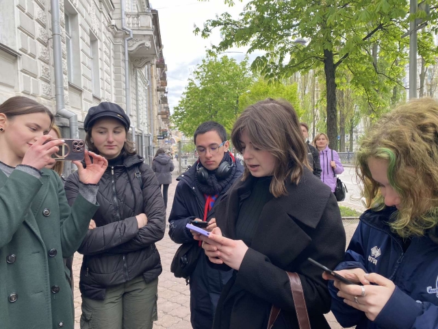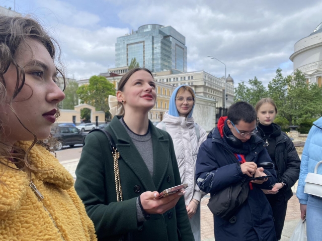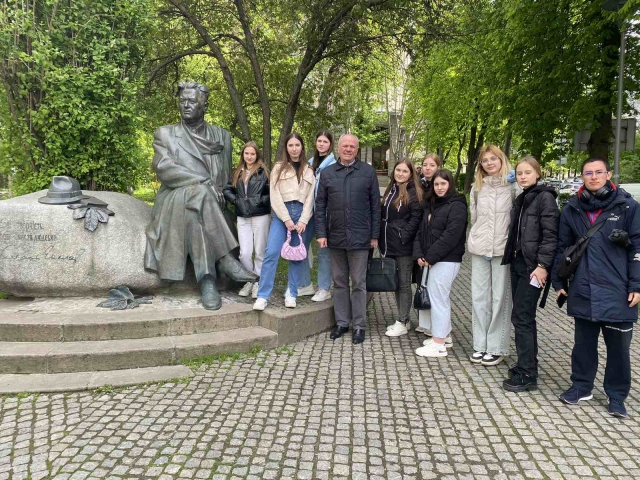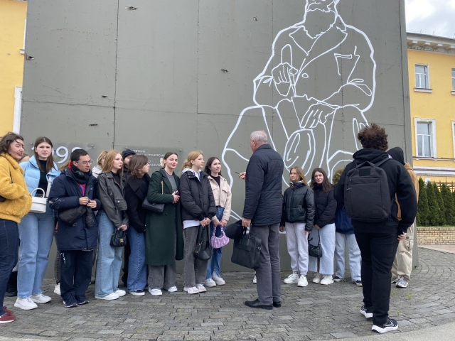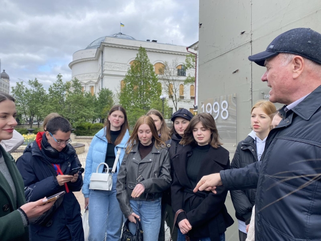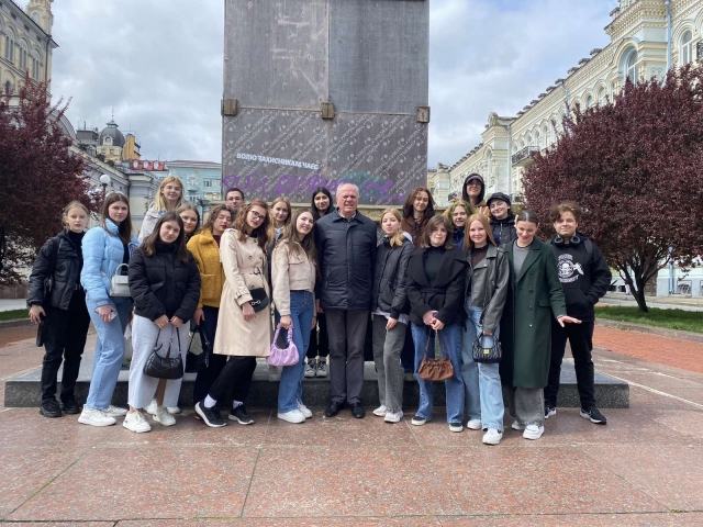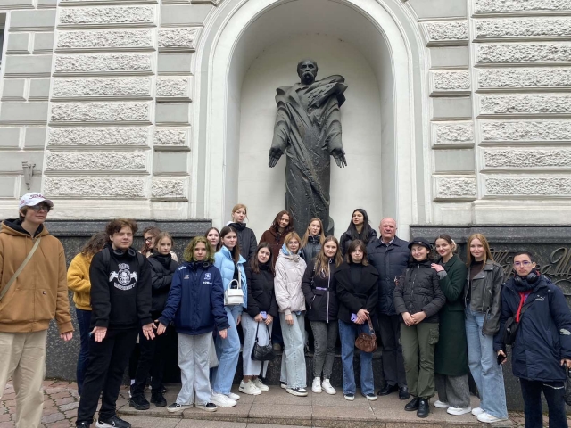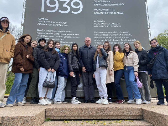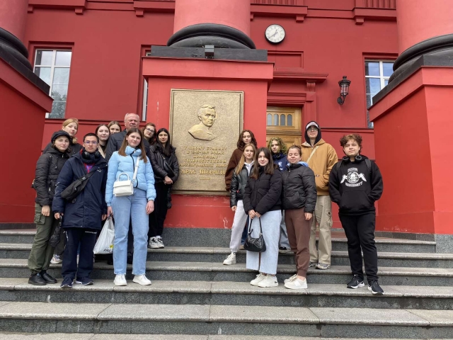 Студенти 1 курсу спеціальності «Журналістика» гуманітарно-педагогічного факультету продовжують мандрувати Києвом разом зі своїм куратором Миколою Івановичем Степаненком. Об’єктом нашого духовного пізнання стали пам’ятники видатним українським діячам (Тарасові Шевченку, Миколі Лисенкові, Михайлові Грушевському, Олесеві Гончару). У війну вони опинилися в риштованні, але наснажені високою ідеєю думки, неперевершені мелодії, цих величних особистостей, як кажуть у немирний час, – на передовій. Вони надихають наших воїнів, уселяють віру в неминучу перемогу всім нам. Микола Іванович готував своїх вихованців до цього дійства, вони ознайомилися з історією пам’ятників. До того ж кожен одержав індивідуальне завдання, отож вийшла злагоджена й цікава розмова.