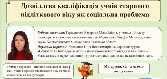 Особливий інтерес у нас викликає секція «Соціологія», оскільки наукові роботи учнів присвячені різноманітним соціальним проблемам. Так, наприклад: Катерина Г. досліджувала дозвіллєву кваліфікація учнів старшого підліткового віку як соціальну проблему;