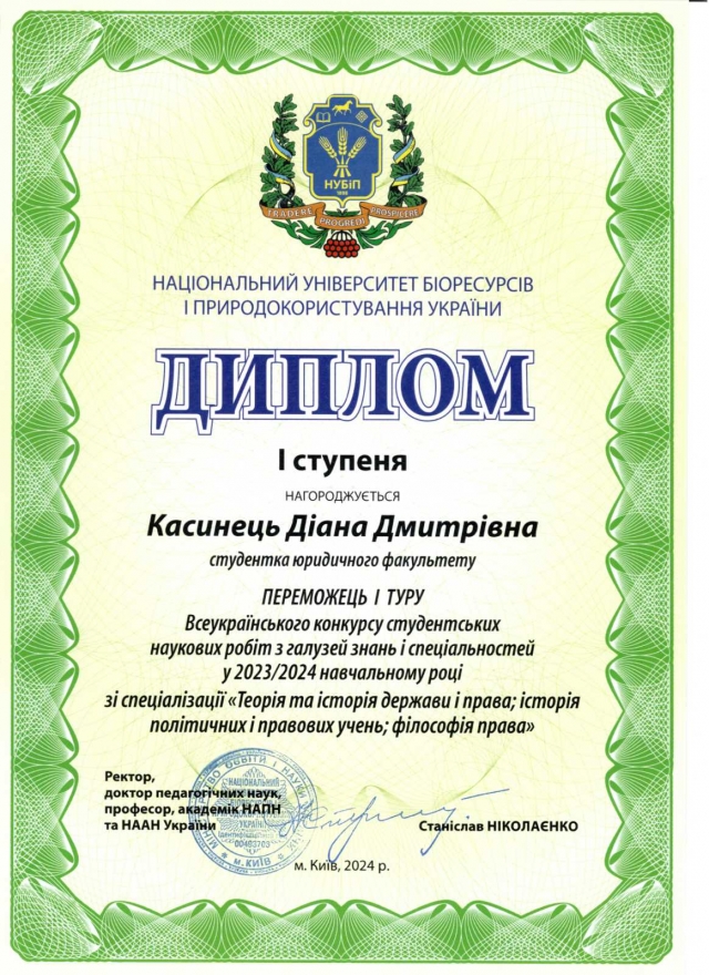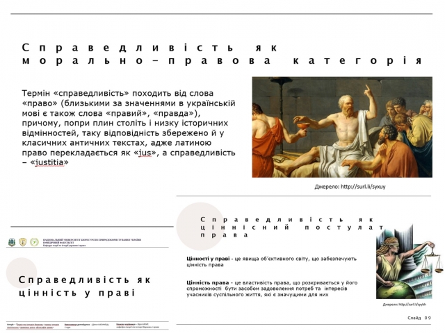 Діана Касинець представила наукову роботу «Справедливість як цінність у праві», в якій закцентувала увагу на таких трьох аспектах: 1) справедливість як морально-правова категорія; 2) види справедливості у праві і 3) справедливість як ціннісний постулат права. Її виступ викликав питання і дискусію серед присутніх науково-педагогічних працівників професорів Олени Гулак та Віктора Ладиченка.