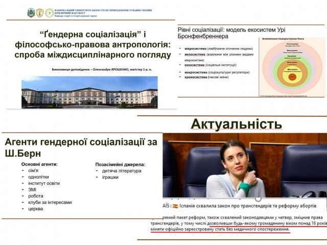 А ось Олександра Ярошенко торкнулася не менш болісної теми для нашого суспільства – гендерної соціалізації. Зокрема, вона здійснила спробу показати взаємозв’язок гендерної соціалізації та філософсько-правової антропології через призму міждисциплінарного підходу. Вона поступово і всебічно дала відповідь на три головні питання: 1) що таке філософсько-правова антропологія?; 2) що таке «гендерна соціалізація»?; 3) яка роль права у забезпеченні майбутнього людства?