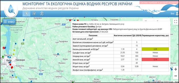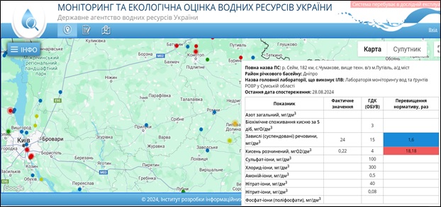 с. Манухівка (а також в районі сел Чаплищі та Клепали) засвідчив продовження погіршання якості води за вказаними показниками. Станом на 24.08.2024 р., за інформацією на офіційному сайті ДЕІ в Сумській обл., забруднення поширилося вниз за течією до населених пунктів Хижки, Камінь, Мутин. В цей період прикордонні підрозділи ще продовжували фіксувати помутніння води в р. Сейм поблизу державного кордону. Перші ознаки забруднення води р. Сейм на Чернігівщині почали проявлятися вже 26.08.2024 р. З цієї дати на території Батуринської міської громади громадянам заборонено використовувати воду для господарських потреб, купання та риболовлі. Дані системи державного моніторингу якості поверхневих вод (рис. 2) показують, що вже 27.08.2024 р. забруднена вода в р. Сейм досягла м. Батурин (Чернігівська обл.). Тут зафіксовано перевищення вмісту амонійного азоту більше ніж у 5 разів, що свідчить про «свіже» забруднення цієї ділянки річки. Також екстремально низьким був вміст розчиненого кисню у воді – 1,18 мгО2/дм3. Рис. 2. Забруднення р. Сейм в м. Батурин (Чернігівська обл.), 28.08.2024 р. (за даними геопорталу «Моніторинг та екологічна оцінка водних ресурсів України»Як бачимо на рис. 3-4 станом на 28.08.2024 р. на території Сумської обл. (с. Чумакове та с. Озаричі) в р. Сейм ще присутнє забруднення води із перевищенням затверджених нормативів.
