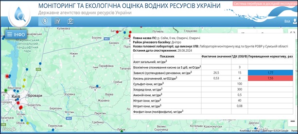 Рис. 3. Забруднення р. Сейм в с. Чумакове (Сумська обл.), 28.08.2024 р. (за даними геопорталу «Моніторинг та екологічна оцінка водних ресурсів України»