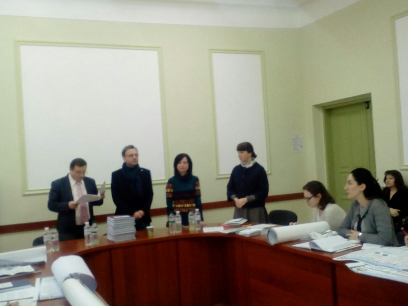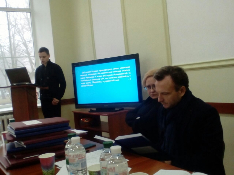 У складі комісії були: голова – завідувач кафедри романо-германських мов і перекладу, доктор педагогічних наук, професор Малихін О. В, члени комісії – завідувач кафедри іноземної філології і перекладу, доктор педагогічних наук, професор Амеліна С. М., завідувач кафедри англійської філології, доктор педагогічних наук, доцент Арістова Н. О., кандидат філологічних наук, доцент Ольховська Н. С. На заході були присутні й керівники наукових робіт: кандидат філологічних наук, доцент Козуб Л. С., кандидат філологічних наук, доцент Сидорук Г. І., кандидат педагогічних наук Монашненко А. М.