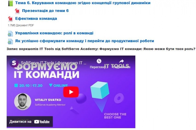 Для цього, під час вивчення дисципліни, а також в рамках співпраці з компанією SoftServe, були проведені тематичні гостьові лекції від менторів SoftServe академії, а записи – розміщені у відповідному електронному курсі.