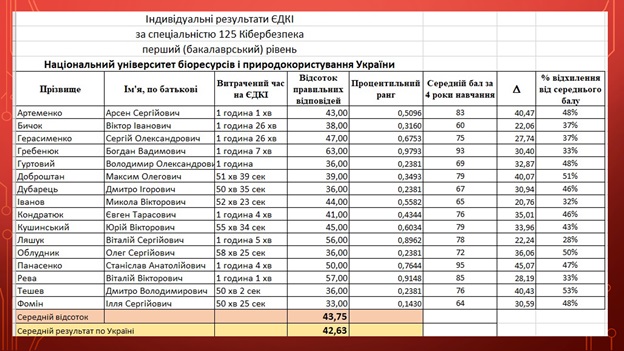 Тобто результат пробного ЄДКІ з кібербезпеки студентів НУБіП України більше середнього по Україні. Ухвалено рішення провести аналіз по кожному з розділів ЄДКІ і посилити роботу по підготовці до ЄДКІ наступного року.