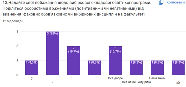 Аналіз результатів анкетування студентів представила заступник декана Клименко Наталія Анатоліївна. Акцентувала на загальному позитивному враженні студентів від організованого факультетом дистанційного навчання.