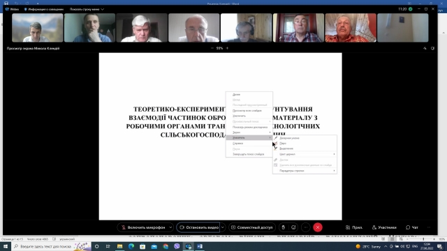 27 червня 2022 року відбулось засідання наукової ради факультету конструювання та дизайну машин НУБіП України з розгляду дисертаційної роботи здобувача Клендія Миколи Богдановича на тему "Теоретико-експериментальне обґрунтування взаємодії частинок оброблюваного матеріалу з робочими органами транспортно-технологічних сільськогосподарських машин", поданої на здобуття наукового ступеня доктора технічних наук за спеціальністю 05.05.11 – машини і засоби механізації сільськогосподарського виробництва. Рецензенти: академік НААН Булгаков В.М., член-кореспондент НААН Головач І.В., професор Роговський І.Л.